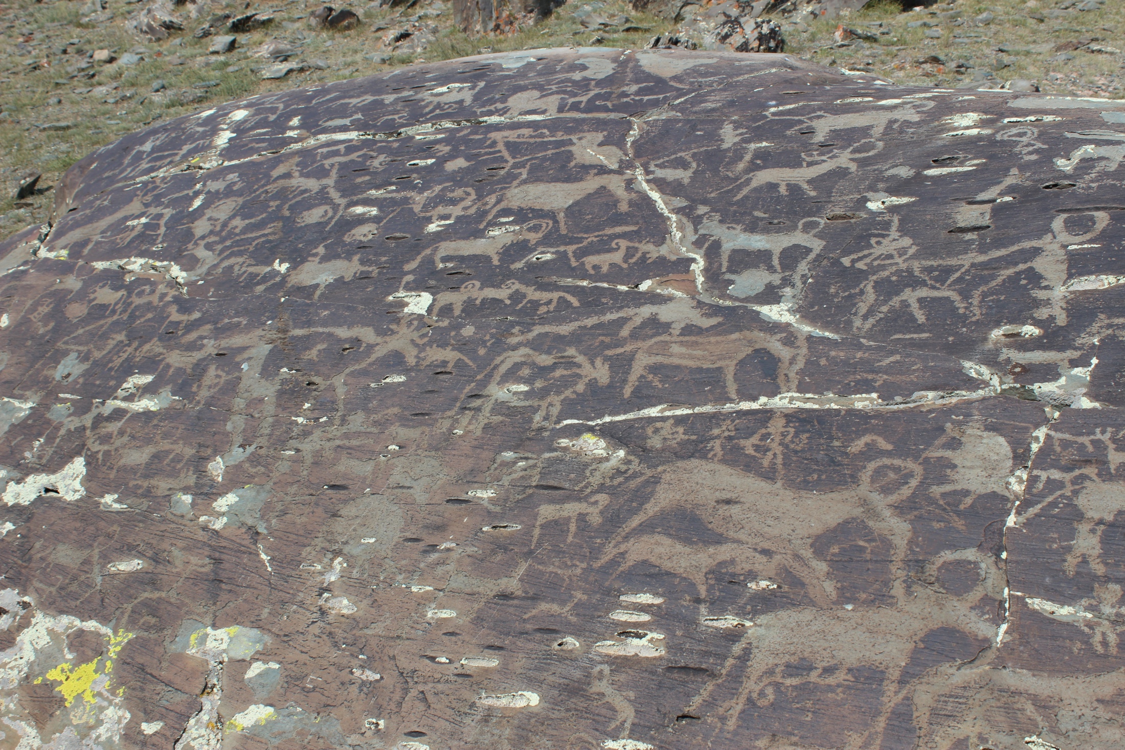 Tsagaan Salaa rock paintings are located in the most western part of Mongolia. In 2011, all the Mongolian Altai’s petroglyphs were inscribed on the UNESCO world heritage. Tsagaan Salaa is one of the sites concerned by this protection. The site is located inside Altai Tavan Bogd National Park and covers 15 square kilometres. We can see about 10000 paintings on the rocks that scatter the southern part of the white river, ”Tsagaan Gol”. This important collection of pictograms dates back to a large period going from Neolithic to Bronze Age, and mainly represents hunting and breeding scenes (with herds or lonely animals). These rock paintings are an important treasure for many reasons: not only because they’re very numerous, but also because the painted subjects and their composition have a big expressiveness and are real historical and artistic witnesses of a period. Relating the transition between a primary society, based on hunting and picking, and a breeding society, they give us precious information about the beginnings of nomadic pastoral economy in Mongolia.